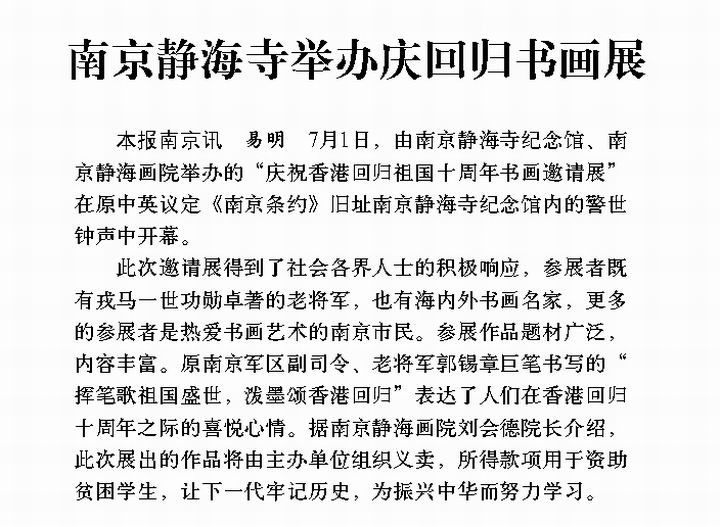 » 转载<美术报>:南京静海寺举办庆回归书画展