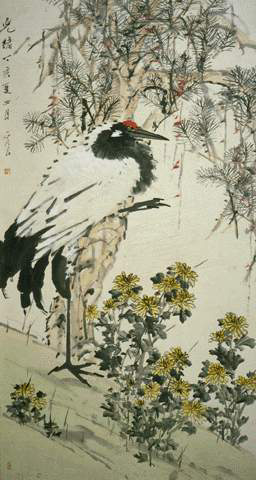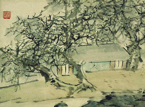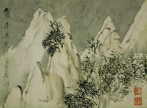 顾鹤逸曾称虚谷作画“清而不枯,密而不乱”。这一幅梅鹤图就充分体现了虚谷的用笔特点。梅树始以湿笔淡墨写出,后以干笔复加勾点,线条断续顿挫,笔段而气连苍劲而松绣形成清虚的韵味。梅花以圆笔勾画,瓣似珠玉,稚拙古朴。鹤用笔极简用浓墨写头尾羽。画面设色清淡,鹤顶却以朱红重色点醒,使整幅画冷俊之中又富变化,质朴而又耐人寻味。