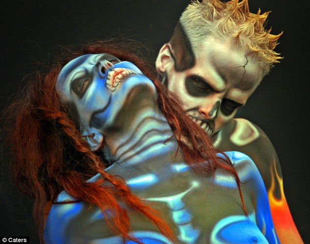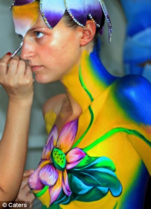 两名人体彩绘艺术家在模特身上进行最后的勾绘