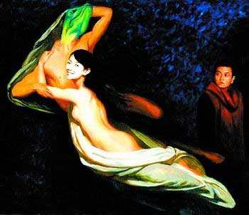 昨日,记者在猫扑看到这幅徐静蕾的裸体油画,老徐上半身至臀部完全裸露,只披一件薄纱,她侧身抱住一个青蛙脑袋人身的怪物。不远处,王朔身穿红衣,回头凝视他们。这幅油画的作者,正是恶搞名人油画系列创作者安迪。昨天,安迪告诉记者,这幅画画于去年,是恶搞名人油画系列之一,因近日王朔与徐静蕾近日成了舆论的焦点,画作又受到网民关注。对于为何选择画徐静蕾,安迪说:“徐小姐属于智慧型女性,智慧女性多是端庄典雅,很少有裸体。经常裸的明星,画起来反而没意思。”安迪表示,徐静蕾与裸体,正是追求反差效果。他认为,作品是对徐静蕾的一种美化。