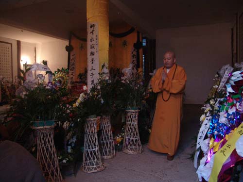 在圆霖长老灵堂前传义大和尚顶礼三拜,