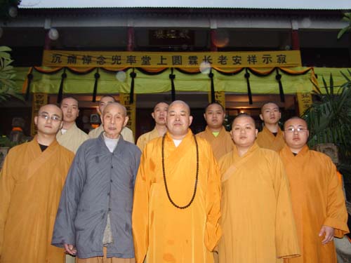 2008年5月9日清晨,传义大和尚率全体执事到江浦兜率寺悼念当代著名画僧、兜率寺方丈圆霖长老,在兜率寺当家师带领下步入圆霖长老灵堂,传义大和尚和全体执事念佛合十,绕圆霖长老三匝后,顶礼三拜,传义大和尚高声呼:“圆公上人请您一路平安” !