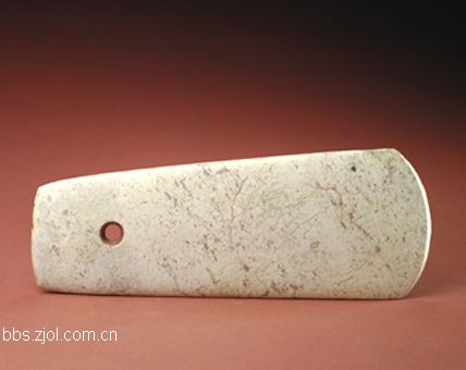 14、玉花斑弧刃斧...新石器时代含山文化,长23.7cm,宽8.7cm。 此玉斧玉料呈青灰色并有较多的自然纹理而形成暗花。斧为长条形,略扁,刃部呈前凸的弧状,斧顶略窄,近顶部有一圆孔。 此玉斧于1987年在安徽省含山县凌家滩新石器时代墓地的M4号墓葬出土。墓葬中有大量的随葬玉器,其中包含许多精品,如玉勺、玉龟甲、玉刻图板等,并有大量玉斧。由此推测,墓主人是地位显赫的人物,所葬玉斧既象征权力,又标志着财产的丰厚。此件玉斧是随葬玉斧中制作最精致的一件,斧的刃部锋利,有一定的厚度和重量,具有实用性。其玉材虽因埋葬时间久远而发生了颜色的变化,但仍不失华丽的本色。斧的表面光滑,磨制精细,顶部略糙,可知顶部原嵌于木柄中因而未将其磨光。此件作品显示出玉斧由实用工具向礼仪用器的转化。