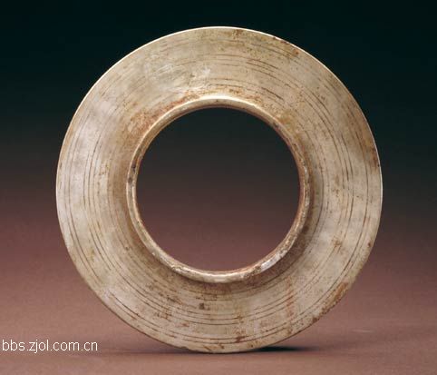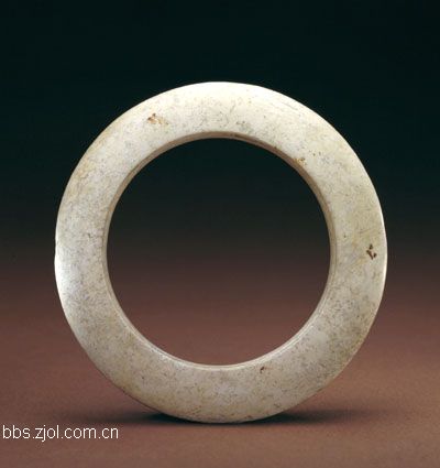 11、玉环...外径9cm,孔径6.2cm,厚1.3cm。新石器时代含山文化。 玉环因沁蚀成牙色,外沿薄,近孔处较厚,剖面近于三角形。此环造型规矩,素面无纹,磨制光润。 含山文化出土环形器多件,唯此器最精美。玉环在新石器时代诸文化中曾有多处出土,数量较多,但剖面呈三角形的非常罕见,它对后世特别是战国时期玉环的影响颇大。 此玉环为1987年安徽省含山县凌家滩墓葬出土。