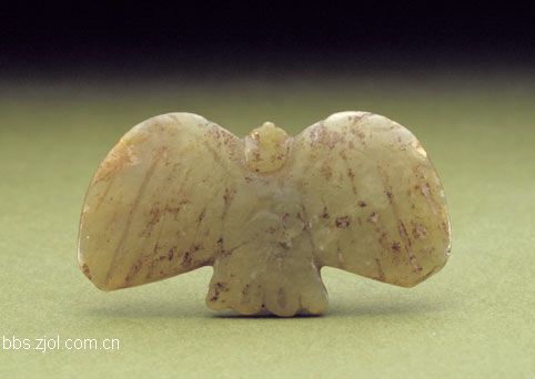 17、玉鹰...高2.5cm,宽4.6cm,厚0.4cm。新石器时代红山文化。 玉鹰为青黄色玉材制,片状,腹部略厚,腹前用阴线界出鹰爪,头部凸起,嘴尖,双翅较薄,尾宽,尾及翅上有阴线羽纹。鹰背部有对穿的孔,可穿系绳。 红山文化分布于我国东北地区,在其遗址中发现了较多的玉器,其中有一定数量的玉鸟,多为鹰类。常见的玉鹰有二类,一类近似方形,翅的边缘平直;另一类鹰的翅膀大且展开,似飞翔状。这件玉鹰属后一类,辽宁省阜新市胡头沟遗址出土有同样的作品。此玉鹰的造型较接近于现实,鹰的腹面加工精致而背部简练,系因人们仰望飞鹰所得的观察结果。