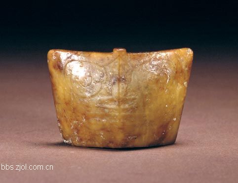 19、玉璜...高5.2cm,长10.6cm,厚0.3cm。新石器时代崧泽文化。 璜玉料材质较好,黄褐色,较薄。近似半圆形,直弦,中部下凹,两侧各有一孔,底部两角略向外伸。璜的一面有弧形凹槽,是对玉料开片时留下的切割痕,这类切割痕在新石器时代玉器上时有出现,从痕迹上可以看出,玉器加工中采用的是线切割的剖料方法。玉片厚度约0.3cm,表明当时玉料开片技术已达到一定的水平。作品呈不规则的半圆形,两角外伸,说明此璜并非由圆形玉器切割而成,可能是以长方形或三角形玉片磨成。