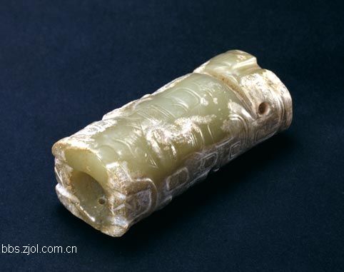 20、夏商周玉龙形"勒玉"(勒上玉下,一个字,下同,楼主注) 玉龙形"勒玉",商,高2.3cm,长6.5cm,宽2.5cm。 (音勒)以青玉制,有白色沁,圆筒形,两端粗细不等。器表饰龙纹,其龙纹特点是“臣”字眼,并饰有重环纹、鳞纹等。 商代的玉龙,由龙眼的变化可分为早、中、晚三个时期,早期的龙眼为方形或菱形,中、晚期为“臣”字形。重环纹和鳞纹直至西周中晚期才出现在青铜器上,因此本器上的这两种纹饰对于玉器和青铜器装饰纹样的比较研究有重要的意义。