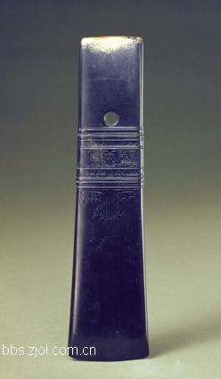 2、古玉圭...经染色呈漆黑色,器身扁而长,一端略宽,有刃,另一端有一孔。圭两面皆有纹饰,一面中部为阴线兽面纹,兽面的上、下方分别饰阴线绳纹及成组的凸线,另一面的主体纹饰同前一面大体相同,下方有一组凸线构成的变形兽面纹。目前为止,考古发掘中尚未发现有类似凸线纹饰的玉圭,对这件玉圭的制造年代,学者多有推测,一些学者认为,玉圭应为新石器时代晚期的作品。