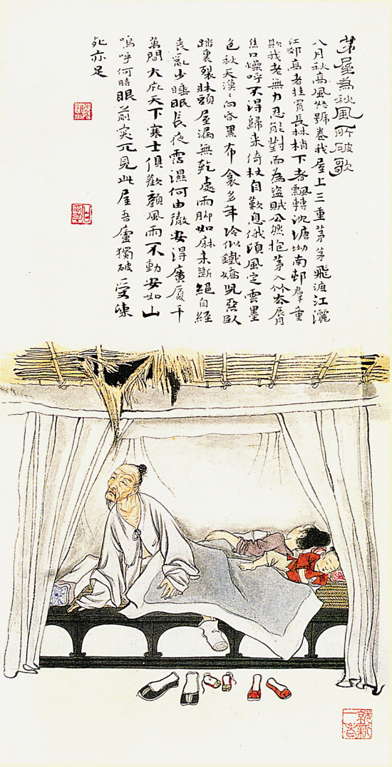 此件陆俨少疑伪作品《茅屋为秋风所破歌》图1,便是高科技时代的书画造假产物。由于作伪者使用了某特种定位仪器参照着真迹本图2来作伪,最终赝制效果显得相当逼真。使得该疑伪作品到后来“躲过”了重重把关,竟然被选入去年6月在上海美术馆为纪念陆俨少诞辰100周年而举办的“流光溢彩——陆俨少作品展”中,并展示于展厅的最显要位置。当时此画左边还配置有陆俨少次子陆享用毛笔书法题写的洋洋洒洒近五百言的“赞美”跋文,提起这一幕,现在无不令人感到遗憾。通过一真一伪俩图比较可知:它们“画”的尺寸相同,面目基本一样,连有的小细节诸如某处笔线起承转合的运行态势也很接近,包括三方伪印章的印文和钤盖位置也都如法炮制。且伪作还经过做旧处理,表面气息似乎更加“古典”。难怪有不少圈子里人都说现在专家“打眼”(收藏界俗语,意指看错了署名某名家作品,以假当真了)是书画鉴藏界再正常不过的事了。