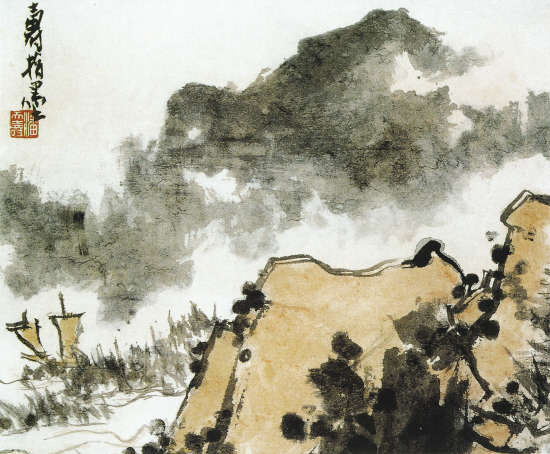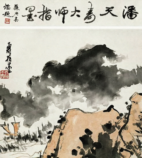 款署“潘天寿”的图(1)指墨画疑伪成品入拍于南方某拍卖行2004年冬季拍卖会,成品上方还配有一位著名鉴定家题写作的“潘天寿大师指墨”的诗堂。此画尺幅不大,章法相对较简捷,题款也仅有“寿指墨”三个字,画的只有寥寥几笔的指墨画山水内容的点线与块面,敷着浅淡的赭石色彩。仅看画面,该图的笔墨气息似乎不算疲弱,漏洞也并不多。但要是它面对着对潘天寿艺术较熟悉的人就难混过去了。由于其原作母本曾被编录进多种版本的潘天寿的作品集册,见图(2);加上该画家作品存世量较少,不少鉴藏者对潘极其有限的作品及其出处往往印象深刻,故相对较容易发现这类印刷伪品的庐山真面目。这或许是此成品造假者在作伪操作以外的一个“疏忽”,不过图(1)确实具有前所未有的逼真效果。