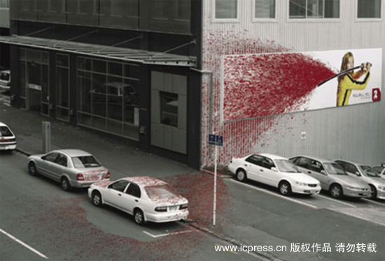 电影宣传广告:鲜血从乌玛-瑟曼(Uma Thurman)的剑上喷涌出来,喷溅到了停在新西兰首都奥克兰的这条街道上的两辆汽车上,当然这两辆汽车是“杀死比尔”制作方雇佣的,这都是为了增加塔伦蒂诺(Tarantino)的这部电影的血腥效果。