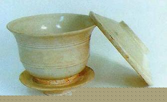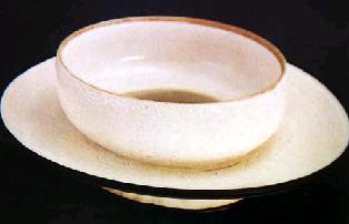 另外,人们不难发现这件茶盏的口沿,露有胎骨,成为毛口,俗称芒口。其实,这是定窑工匠们为适应生产所需,发明了覆烧工艺的结果。覆烧,就是烧制时将盏、盘等器物倒过来,使口部向下。而每件器物间,在口沿部分用未经焙烧的耐火泥作成支圈间隔,层层相叠,故称覆烧。其优点是节省空间,产量增加;又能充分利用热能,节约燃料;还可使器物烧制时受热和收缩均匀;同时,能使器物底部满釉,增加美感。至于芒口的缺陷,定窑的匠师往往以金、银、铜圈镶在口沿上,作为装饰,既弥补覆烧带来的不足,又增加了美观,显得更加豪华尊贵。
