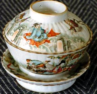 这件清同治粉彩瓷盖茶碗、托,绘人物,笔法稚拙。器型制作规范,用模具成型工艺造型。釉面泛白、釉层匀净。有近代瓷器的风格特征。