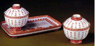 这件清乾隆御制诗款茶具,有两个盖茶碗,一个茶盘。造型端庄规整,制作均甚精致。盖碗、茶盘精美纤巧,令人爱不释手。诗词装饰,以红彩楷书书写,