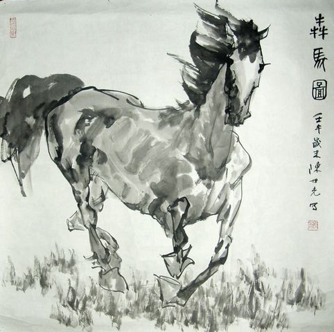 在人类的现实生活中马的历史贡献最大,它是定国安邦的强大支柱,是国力强大的象征,因此自古以来历朝君王无不爱骏马。唐明皇御厩名驹骏马多至四十万匹,所以唐人画马名家辈出,载史的就有曹霸、陈闳、韦偃、韩干,尤其是韩干的成就最突出,给予后人的影响启迪也最大,他那以真马为师的名言至今仍为画家津津乐道遵循。此后的宋代李公麟,元人任仁发,现代的徐悲鸿更是家喻户晓。不同的时代画家寓于马以不同的时代精神:韩干笔下的马具有雄健而驯善的性格,骨坚肌丰,既显示出大唐帝国强盛的时代精神,也特具神骏的不可征服的气势;徐悲鸿的《奔马》意在山河百战归民主,铲尽崎岖大道平;而世光的马在承继前辈大师成就的基础上,着意于无拘无束的自由奔放的精神气质和着力于中西画法的融合,以书法入画法,以墨色塑体积,充分利用宣纸的渗化性能,着笔时灵动潇洒随意,不刻意求工,不着眼于细节的完整真实,尤重马的神情动势,竭力追求马的灵动、奔放自由之情态。令观者得轻松愉快之美感。他画的奔马飞动如风,笔墨中黑白相间相符,虚实相宜,画家十分重影象造型,使马的形象富有力度分量和体积感;画面的置阵布势以马为主体,充满画面空间,在有限的画面上充分利用空白再现无限之深远博大境界,奔马之势有冲出画外之势;