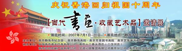 庆祝香港回归祖国十周年当代书画名家邀请展”得到了刘振华将军、郭锡章将军、兰保景将军、吕振林将军等十位老将军的大力支持,同时还得到社会书画名家、书画院的积极响应:国家一级美术师、著名书法家、篆刻家石学鸿先生,国家一级美术师、著名书画家岳鸿武先生、施正东先生,洛阳牡丹画院副院长罗玉祥先生,著名书法家武中奇之女、山东省青州市书协副主席武晓临女士,南京芳草园书画院院长蔡志芳女士,南京艺海潮书画院院长方军先生,南京艺海潮书画院秘书长夏志诚先生,这次书画邀请展还得到企业家南京南天印务有限公司陈天奎先生、南京十三香大酒店(三汊河店)总经理戴加良先生、南京凯凯农副产品有限公司总经理闫国清先生在经济上的大力支持。