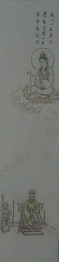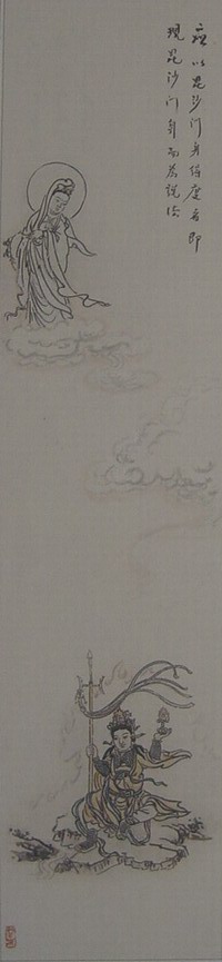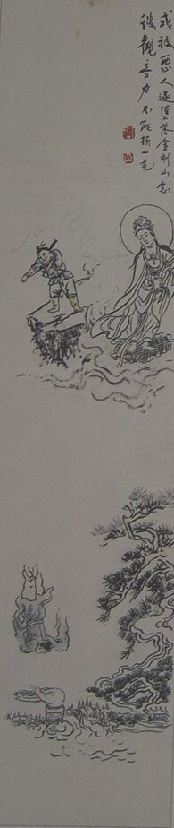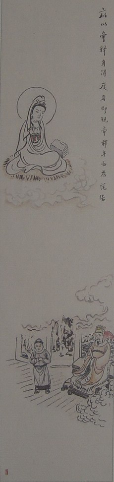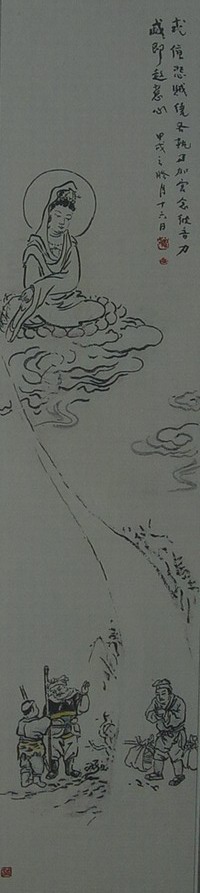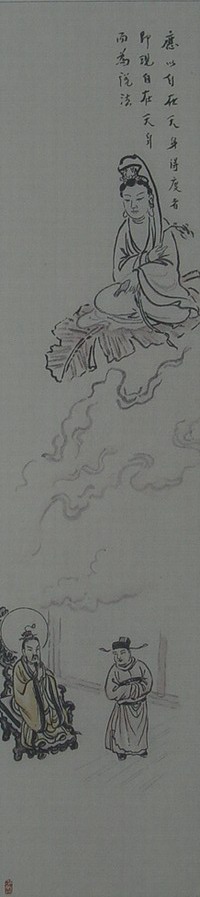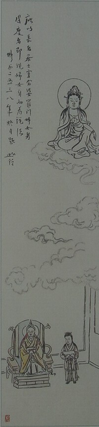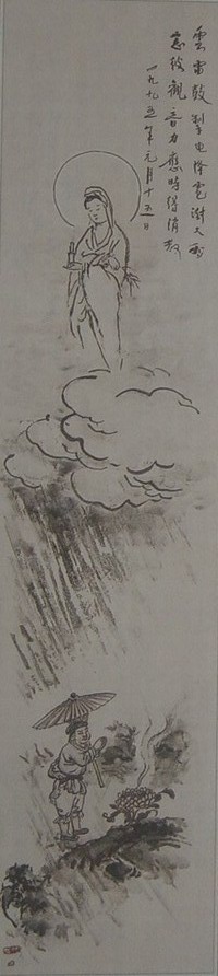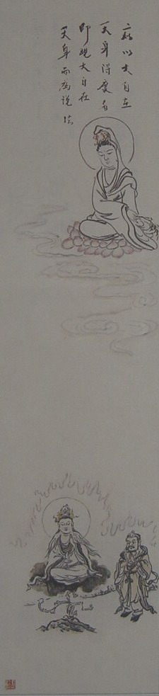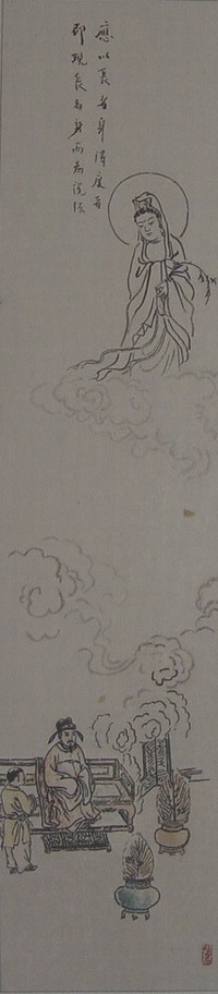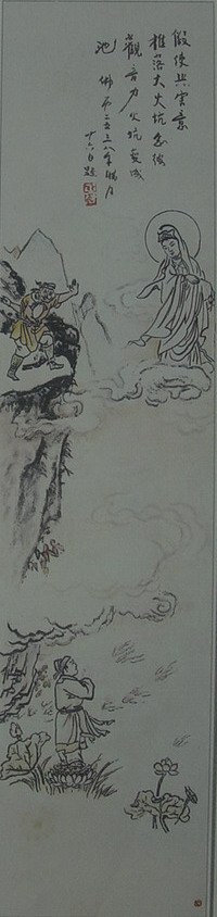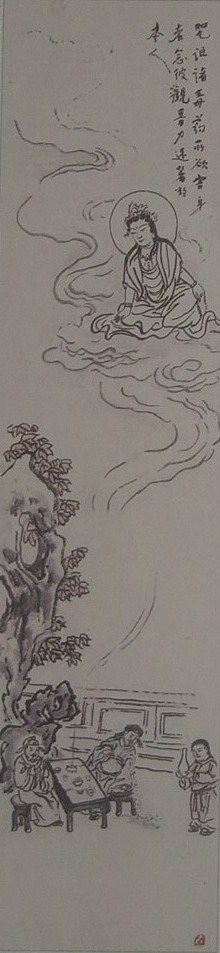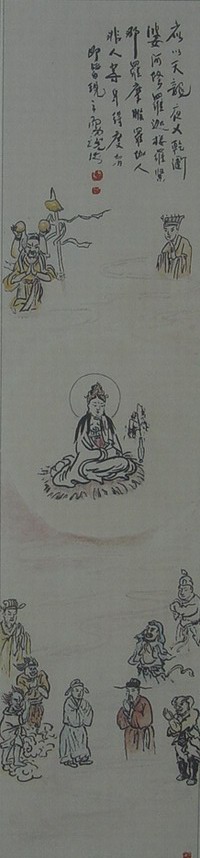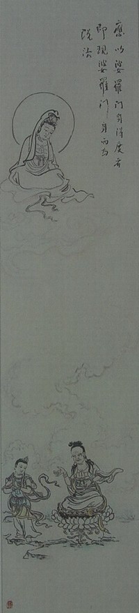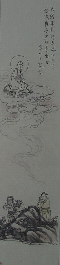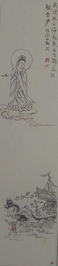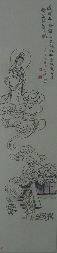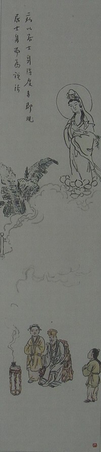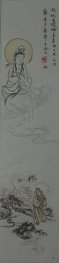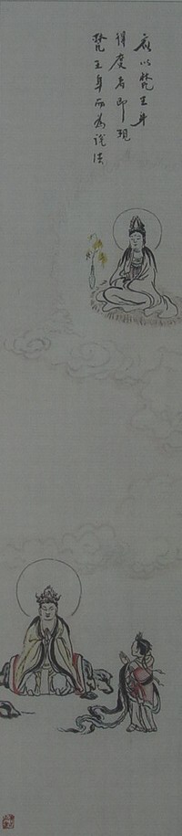 圆霖大师善画观音、西方三圣等佛教人物画。早年工笔,一丝不苟;晚年写意,简约恣意,三笔两笔,形同书写,而人物神情毕现,可见书画同源之精神。笔者曾观赏圆霖大师所绘13幅《观世音菩萨救苦救难图》,此图实则为观音大士救济人间苦厄之13个故事,所以幅幅画面不同。笔者所见《观世音菩萨三十二应身》之19幅应身图,亦图图有别。圆霖大师曾应苏州灵岩寺方丈明学法师之邀,图绘工笔重彩人物画之莲宗十三祖师像,瞻仰之中,但见张张传形、页页传神。同出大师之手的16尊简笔写意人物画,则风格迥异,惟见墨线勾勒,赭色淡着,素雅平淡之中益增佛界气氛之庄严。
