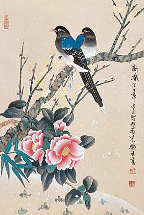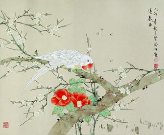 回顾历史,中国工笔重彩花鸟画从人物画配景地位脱离出来,便如蛹化蝶,振翅而飞,曾有过五代两宋的辉煌时期,无论题材、形式、技法、意境等方面都有很大的开拓和创造;许多画家曲尽物理、穷究生态,表现了花鸟的自然之美,并赋予种种寓意和诗的情趣,许多优秀之作,成为后世难以企及的典范。因此今天复兴工笔重彩花鸟画,起点和要求都是很高的,既要继承,更要超越,进入前人所未曾达到的更高的艺术境界,这是时代向画家们提出的难题。