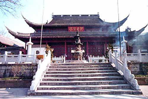 栖霞寺又名栖霞精舍、功德寺、妙因寺、崇报寺、虎穴寺等,位于南京市东北二十余公里处的栖霞山上,始建于南齐永明元年(483),为江南三论宗的发祥地。栖霞寺占地40余亩,有山门、天王殿、毗卢殿、藏经楼等大小殿堂几十所。藏经楼内珍藏有《大藏经》七千余卷,另有各种书籍一万四千余册。寺外右侧是舍利塔,始建于隋文帝仁寿元年(601),后唐时再建。塔用白石砌成,高约15米,为八角五级,构筑别致,须弥座以五层密檐式塔室构成。全塔不仅结构精巧,而且雕刻华丽细致,人物栩栩如生,堪称精品。往东便是千佛岩。内有佛像五百余尊,其中最大的佛像是无量寿佛,高约10米。左右两侧是观音、大势至菩萨立像,组成"西方三圣"。周围岩壁上遍布佛龛和佛像。这些佛像精美壮观,反映了古代工匠的聪明智慧。是佛教全国重点寺院。