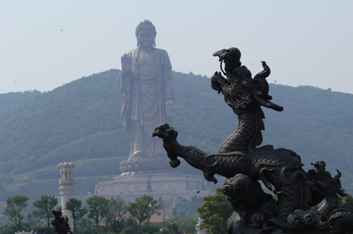 通过祥符禅寺山门,进天王殿,入大雄宝殿。出大殿经后院门,即至朝拜广场。由此迈步218级登云道。最后到达大佛座前的大平台。翘首瞻仰灵山大佛站在一朵盛开的莲花上,好似始从天上降临人间。大佛形体雄伟,仪太安祥,面如满月,慈眉慧目,开颜微笑,口似欲启又目,状若演说妙法犹末了。右手“施无畏印”,左手“与愿印”。大佛通高88米,顶天立地,大有“天上天下无如佛”的气势。大佛背后为秦覆峰,左青龙,右白虎,二山相拱,三峰屏立,重峦叠嶂,云蒸霞蔚,犹如“诸天听法苍茫际,万佛垂慈此翠间”。