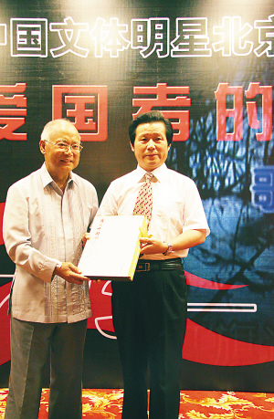 何振梁在北京申奥成功7周年主题活动现场欣然接受言恭达《我的中国心》书法长卷集