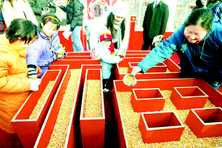 人们往“福”字料里撒五谷杂粮,企盼来年五谷丰登