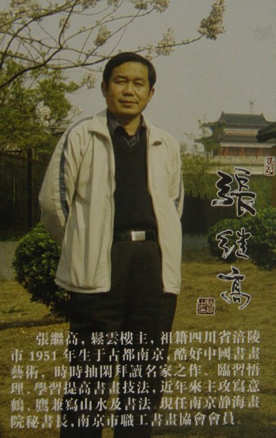 张继高,字尉晋,号陵石。1951年出生于南京。江苏省国际书画艺术研究会会员,南京美术家协会会员;现供职于南京静海画院任秘书长,擅长写意画鸟,书法,兼工中国山水。画家自幼喜爱书画,青年时得金陵书画名流刘宇甲传授,八十年代初进南京艺术学院进修深造,二十年来,作品多次参展并获奖,被各地新闻媒介、纪念馆刊登、收藏。作者的《松鹤图》作品深受书画界前辈好评。