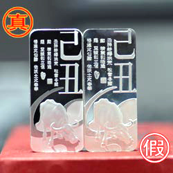 假冒的“牛年贺岁银条”具有极大的欺骗性。记者将假冒的50克“牛年贺岁银条”与正牌的“牛年贺岁银条”进行对比时发现:假冒的“牛年贺岁银条”与正牌的“牛年贺岁银条”仅凭肉眼很难区别,几可乱真。但仔细观察中国金币总公司签发的鉴定证书及包装盒,还是能发现赝品因粗制滥造所留下的痕迹:正牌“牛年贺岁银条”鉴定证书的底纹有“贺岁”两字,赝品没有;正牌鉴定证书上的花边颜色为绿色,而赝品则为蓝色;正牌鉴定证书的水印纸水纹在造纸过程中已形成,但赝品的水印明显是压印上去的,不平整。记者还发现:正牌“牛年贺岁银条”包装盒书脊上有暗纹,这种暗纹待集齐12组之后可以组成“生肖贺岁银条”的字样,但赝品则没有这种暗纹。此外,正牌“生肖贺岁银条”包装盒外屉内部没有纸张掉色所留下的红色印记,而赝品则由于纸张粗糙会留下红色的掉色印记……。