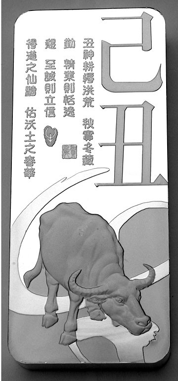上海金币投资有限公司相关负责人在接收本报记者的采访时表示:“牛年贺岁银条”是中国金币总公司继去年成功发行“鼠年贺岁银条”之后发行的第二个系列化的贵金属收藏品,它共有50克、100克、200克、500克和1000克五种规格。“牛年贺岁银条”背面图案主元素为“俯首牛”形象,衬以“牛”字的草书局部,悬白处缀以“己丑”字样及古文段落,文段悬白处补缀古体“牛”字印章及“贺岁”字样篆章;正面图案为发行方徽记、克重、纯度,并绘以草书的“牛”及艺术书法“年贺岁”字样,再缀“己丑”纪年篆章。该银条采取浮雕、喷砂等先进造币工艺铸造。