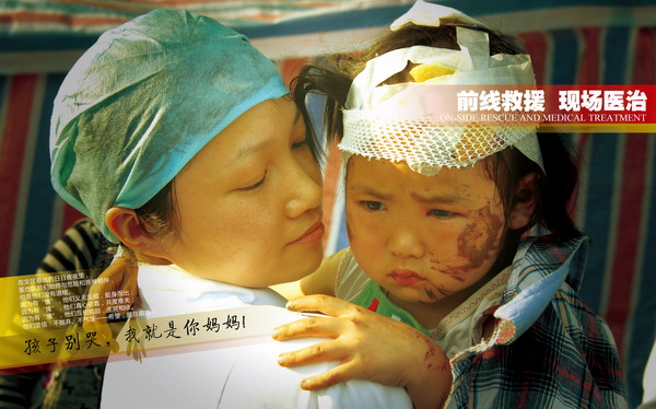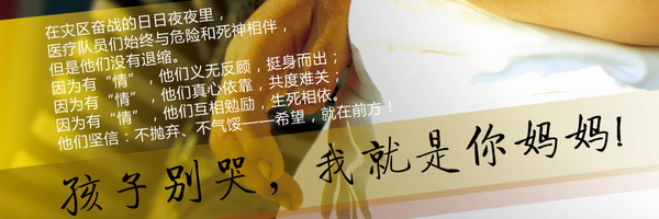 在灾区奋战的日日夜夜里,医疗队员们始终与危险和死神相伴,但是他们没有退缩。因为有“情”,他们义无反顾,挺身而出;因为有“情”,他们真心依靠,共渡难关;因为有“情”,他们互相勉励,生死相依。他们坚信:不抛弃、不放弃,希望,就在前方。