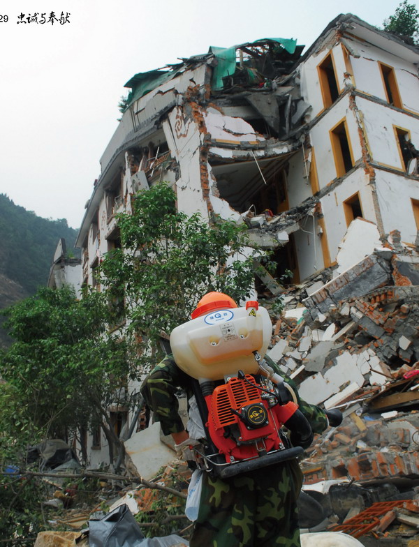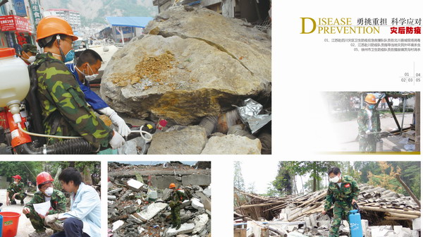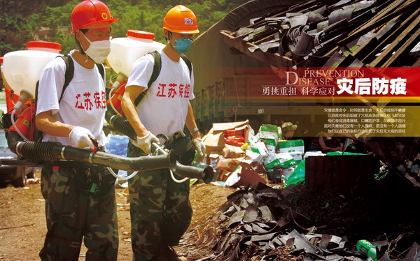 灾情就是命令,时间就是生命,灾后防疫刻不容缓。江苏疾控先后组建了六批188人的应急救援队伍飞赴灾区。他们身背消毒器械、口戴防护罩,在废墟中前行;面对灾难他们没有一个人畏惧、没有一个人退缩,他们以自己的实际行动实现了灾后无大疫的目标!
