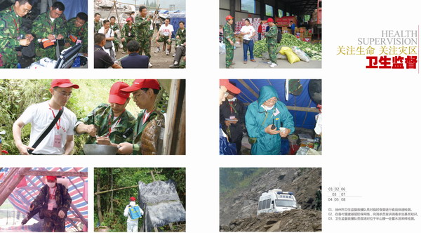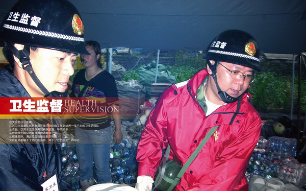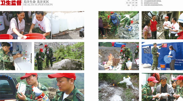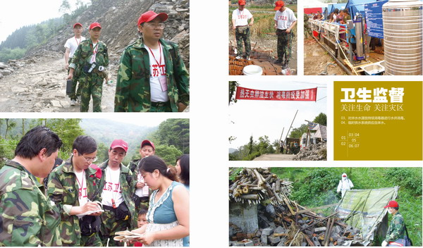 在灾区的日日夜夜,江苏卫生监督队伍从全面开展卫生防病工作到培养一支不走的卫生防疫队,从食品、饮用水卫生保障到疾病监测、环境消杀,从救助受伤群众到处理掩埋遇难者尸体,从搭建厕所、清运垃圾到搬运救灾物品,灾区处处都留下了他们的身影,烙下“江苏卫生”的印记!