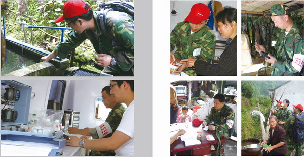 (左中图)卫生监督救援队员现场对于半山腰一处蓄水池采样检测