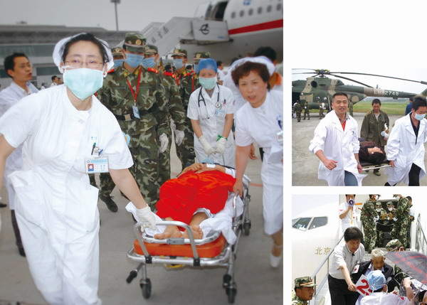 (右下图)江苏省医疗队员与空降兵一起将病人送上火车