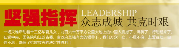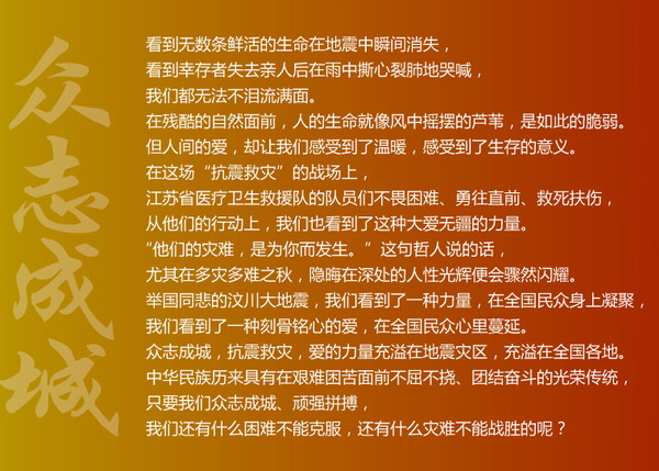 一场灾难牵动着十三亿华夏儿女,九百六十万平方公里大地上的中国人震撼了,沸腾了,行动起来了。在党中央、国务院和江苏省委、省政府坚强有力的领导下,我们万众一心、不屈不挠、友爱互助、自强不息,确保了抗震救灾的决定性胜利!