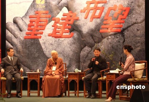 二OO八年六月一日下午,法鼓山文教基金会在台北市举办“重建希望——从四川震灾谈起座谈会”。法鼓山创办人圣严法师(左二)在座谈会上宣布,法鼓山要为四川灾区重建做六件实事:为绵阳市安县秀水镇重建二所小学;为秀水镇建一所中学;在秀水镇建一所医院;为秀水镇重建自来水厂;重建新村,为村民盖房子;设立奖学金帮助受灾青少年完成从小学到中学的学业。曾主持台湾“九二一”地震重建的萧万长(左一)及著名影星李连杰(右二)也出席座谈会。