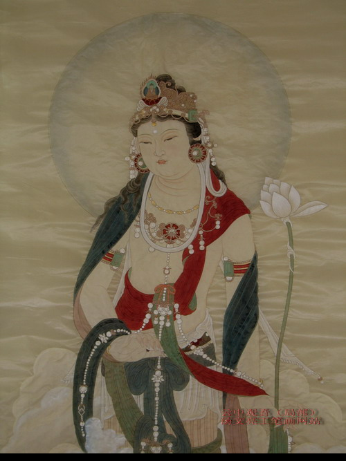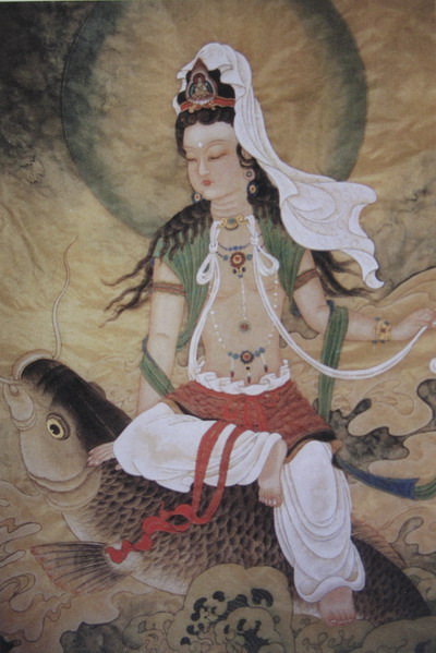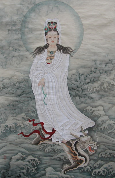 《乘龙观音》一幅,画面上波涛汹涌,乌云翻滚,而观音却独乘蛟龙,神态安祥,作品背景用近乎意笔的表现手法,浓淡相间,酣畅淋漓,尽情表现海浪涛天的壮阔,反衬出观音大士庄严从容与凛不可犯的气度。而《乘鲤观音》整幅作品则洋溢着一种祥和的瑞气,观音身着天衣,悠然的端坐在一尾硕大的鲤鱼之上,任海浪此起彼伏,泰然自若。当你立于作品前时,定会被那摄魂夺魄般的气势所折服,只觉得心中安然,仿佛置身于佛国仙境。