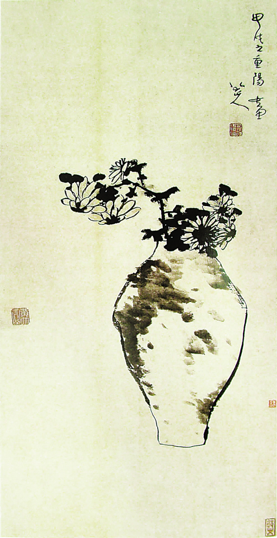 此件署名张大千的图(1)成品在拍卖行现身过数次,其母本图(2)也系我们很熟悉的一幅清代画家八大山人的作品《瓶菊图》。论图(1)成品,它笔墨浮浅,缺失严谨度,像是一位初学者作的临摹品,无论如何与擅长摹古甚至骗过多位鉴定大家眼睛的张氏手迹是“对”不上号的。根据画面迹象判断,这一定是某作伪者先临摹了八大山人真迹《瓶菊图》,然后再在画上伪造出一个像是张大千“摹古”的款识。