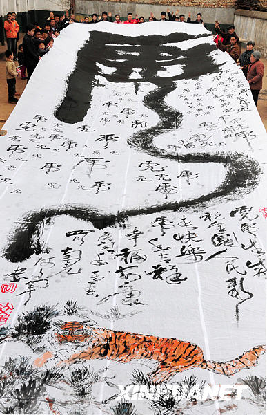 2月11日,四川省南充市书法家何文军在该市南部县五灵乡一个姓虎(音“猫”)的家族里,用长3.8米、重108斤的毛笔,在雪白绸缎上,书写了一个长20.10米,宽5米的巨大“虎”字,并请一群青少年写上其他风格不一的98个小型“虎”字,送给这个家族,恭贺新春。