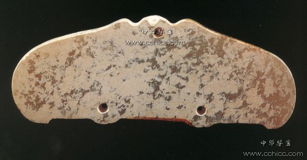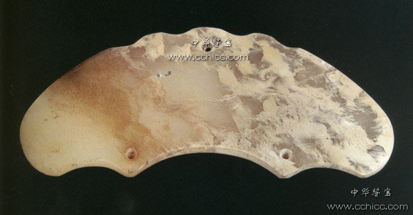 。 25、东晋 玉珩 长7.1,厚0.3厘米 江苏省南京市富贵山墓葬出土,现藏于南京市博物院 青白玉质,通体受沁,表面呈浅白色,玉光莹莹,扁平形状,形如如意云状,又如抽象的鸟形,光素无纹,上面穿有一小孔,下面穿有两小孔。