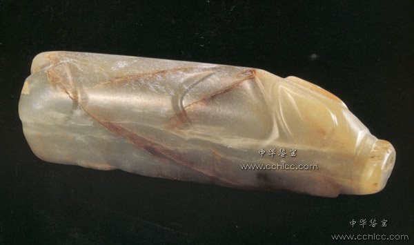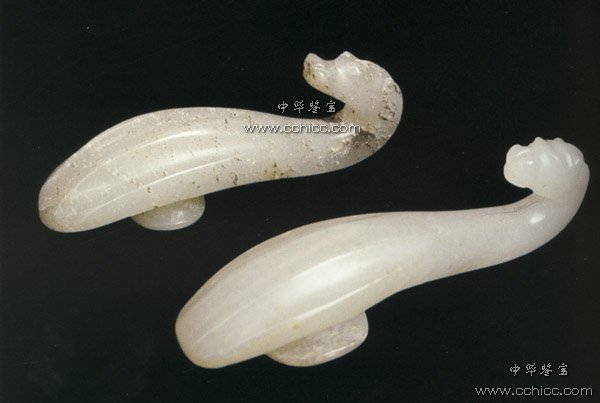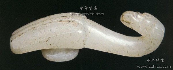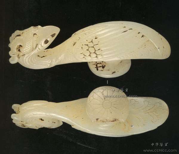 。 37、玉带钩 六朝.jpg (66.25 KB) 2010-4-2 20:54 。 37、玉带钩 六朝 长7.1,宽1.47,高2.24厘米 安徽省当涂县青山六朝墓出土,现藏于安徽省文物考古研究所 白玉,微透明,上有土斑,“S”形,圆雕凤首,呈回首状,采用浅浮雕勾勒出喙,鼻,眼,凤身为椭圆形,浅浮雕刻出羽翅及尾,背面扁平,线刻尾羽,正中凸出一圆饼形扣,上线刻一花瓣图案,器型造型优美,线条流畅,雕技精良。