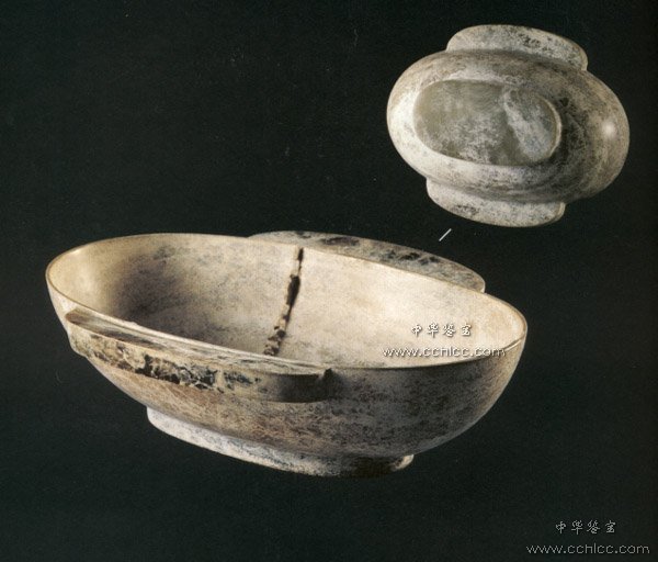 。 32、玉耳杯 南北朝.jpg (61.62 KB) 2010-4-2 20:54 。 32、玉耳杯 南北朝 长径16.95,短径9.8,宽13,高4.8,壁厚0.15厘米 安徽省芜湖市月牙山3号墓出土,现藏于安徽省博物馆 青白玉,受沁严重呈灰白色,仿漆耳杯形制,杯口作长椭圆形,平口,左右各有一月牙形耳,弧圆腹,假圈足,平底,杯内一侧有一类似横隔挡的痕迹,素面无纹,外壁抛光,亮泽。