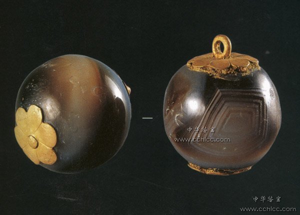 。 35、饰金玛瑙球 六朝.jpg (48.8 KB) 2010-4-2 20:54 。 35、饰金玛瑙球 六朝 高2.74,直径2.35厘米 安徽省当涂县青山六朝墓出土,现藏于安徽省文物考古研究所 紫色,玛瑙纹理清晰,球形,中间贯穿一孔,顶与底部各饰一花瓣形金饰片,上端有一环形纽,通体抛光亮丽。