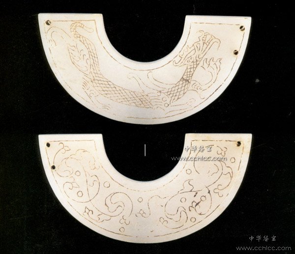 。 39、玉璜 六朝.jpg (67.16 KB) 2010-4-2 20:54 。 39、玉璜 六朝 外径7.2,内径2.8,宽2.2,厚0.3厘米 安徽省当涂县青山六朝墓出土,现藏于安徽省文物考古研究所 白玉微透明,玉质温润。半圆环形扁平体,线刻外廓,内阴刻一张牙舞爪的瘦长体青龙,龙尾上卷,背面阴刻缠枝纹,璜上端两边各有一个和二个圆孔,磨制精致,线条流畅。