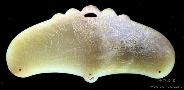 。 41、玉珩 北齐.jpg (34.01 KB) 2010-4-2 20:54 。 41、玉珩 北齐 长9.7,宽4.3厘米 山西省寿阳县贾家庄厍狄廻洛墓出土,现藏于山西省考古研究所 青玉,有光泽,扁平体,蝙蝠形,上端有一孔,下边沿有孔三个,正面线刻一只展翅欲飞的凤鸟,空间以云纹点缀,背面线刻火焰状的云纹。