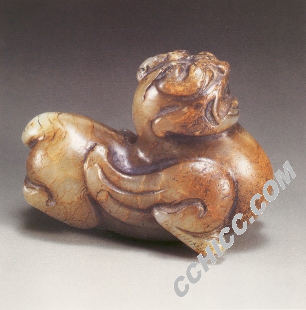 。 33、玉璜 东晋.jpg (57.04 KB) 2010-4-2 20:54 。 33、玉璜 东晋 外径6.8,内径2.8,厚0.6,孔径0.12厘米 安徽省马鞍山市慈湖乡林里村六队东晋墓出土,现藏于马鞍山市博物馆 一侧有两个穿孔,另一侧一个穿孔,素面。表面能看到打磨形成的牛毛状打磨痕。 。 34、琥珀兽形饰 六朝.jpg (75.81 KB) 2010-4-2 20:54 。 34、琥珀兽形饰 六朝 长3.2,高2.4厘米 安徽省当涂县青山六朝墓出土,现藏于安徽省文物考古研究所 紫红色,圆雕,兽首呈张望状,身体浑圆,四肢短小,下腹有一穿孔。造型憨态可爱,刀法刚劲,制作精致,器表光滑。