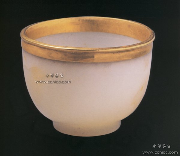 。 45、隋代 金扣玉杯.jpg (39.39 KB) 2010-4-2 20:54 。 45、隋代 金扣玉杯 口径5.6、高4.1、圈足底径2.9、金扣宽0.6厘米 陕西省西安市玉祥门外隋李静训墓出土,现藏于中国国家博物馆 白玉,玉色纯净,玉质温润而富有光泽,杯作大口平唇,深腹,壁上阔下敛,平底,下有假圈足,口沿外一周镶金,白玉衬托金扣,黄白相映,富丽堂皇,造型优美。