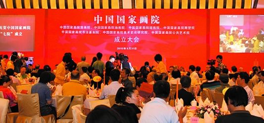 中国国家画院“七院”成立大会于2010年8月31日下午16时在钓鱼台国宾馆芳菲苑隆重举行。文化部部长蔡武,中国文联副主席冯远,国务院编办副主任王澜明,中国国家博物馆馆长吕章申,中国美术家协会主席刘大为,国务院参事室副主任、北京画院院长王明明,中央国家机关工委宣传部部长刘涛,文化部办公厅主任杨建昆,文化部外联局局长董俊新,中国国家画院院长杨晓阳,中国国家画院常务副院长卢禹舜,文化部财务司副司长饶权、马秦临,文化部艺术司副司长诸迪,中国美术家协会副主席曾成钢、许钦松,中国美术家协会秘书长刘健,中国书法家协会副主席申万胜,中央美术学院院长潘公凯,鲁迅美术学院院长韦尔申,天津美术学院院长姜陆,广州美术学院院长黎明,湖北美术学院院长徐勇民,山东工艺美术学院院长潘鲁生,还有以力群、黄永玉、欧阳中石、杨之光、沈鹏、钱绍武、詹建俊、靳尚谊、刘勃舒、杨力舟、韩美林、尼玛泽仁、邹佩珠、郑闻慧、袁运甫、邵大箴、广军等为代表的来自全国各地的著名艺术家,各地方美协和画院的主要领导,文化部、中国文联以及各兄弟单位的嘉宾,中国国家画院的画家和工作人员以及新闻媒体记者共计300余人参加此次大会。