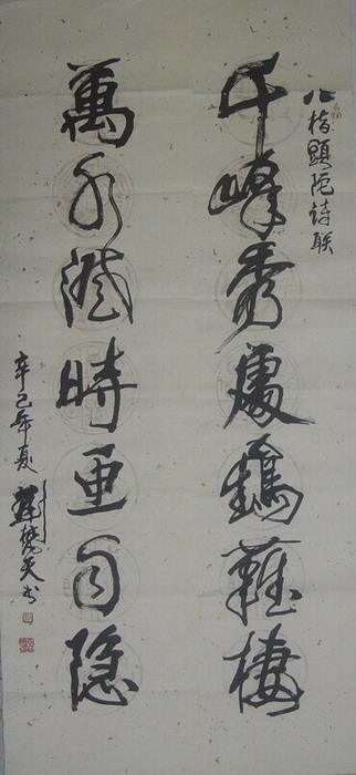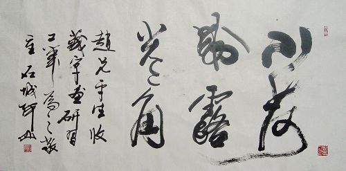 徐茂然先生又遍习历代名家作品,五代杨凝式,明王铎。清黄道周,康有为,赵之谦,何绍基等,遂得悟真行草之法,国画根基坚实,尤其即兴作写意花鸟、山水、笔墨酣畅,富有意蕴,以雅逸清纯为基调。