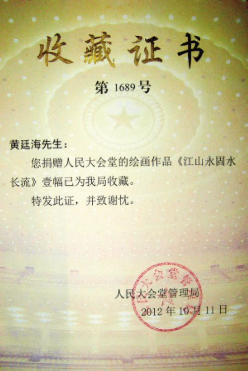 为了迎接党的十八大胜利召开,江苏当代著名山水画家黄廷海应北京人民大会堂管理局的邀请,经月余的精心创作完成了巨幅山水画《江山永固水长流》,并于近日在人民大会堂举行了捐赠接收仪式,人民大会堂管理局向画家黄廷海先生颁发了收藏证书。这是继傅抱石大师的《江山如此多娇》之后,江苏山水画家奉献给人民大会堂的又一幅经典作品之一。